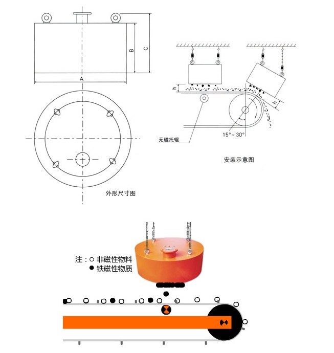 本系列除鐵器為長(zhǎng)期工作制的電磁除鐵器,配有三組可調(diào)掛鉤,能方便的調(diào)整 架設(shè)高度和安裝高度。適合于從較厚料層和較大粒度煤炭、焦碳、礦石、石灰 石、碎石、谷類(lèi)、刨木花等原料中除去鐵磁性異物。